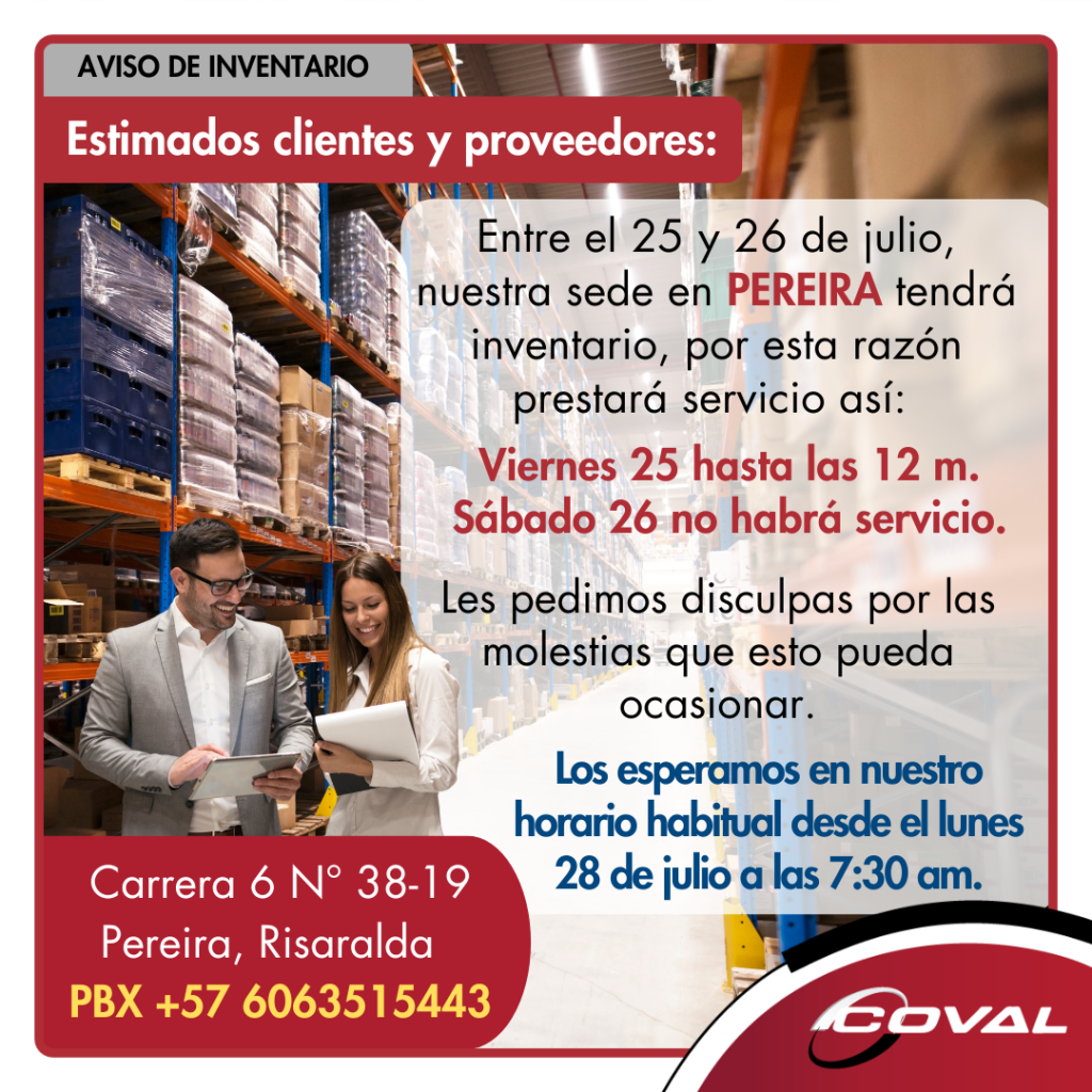 AVISO DE INVENTARIO Estimados clientes y proveedores: Entre el 25 y 26 de julio, nuestra sede en PEREIRA tendrá inventario, por esta razón prestará servicio así: Viernes 25 hasta las 12 m. Sábado 26 no habrá servicio. Les pedimos disculpas por las molestias que esto pueda ocasionar. Los esperamos en nuestro horario habitual desde el lunes 28 de julio a las 7:30 am. Dirección y teléfono: Carrera 6 N° 38-19 Pereira, Risaralda PBX +57 6063515443 #Inventario #Construcción #ferretería #ferreteros #Remodelación #acabados #reformas #Proveedores #Materiales