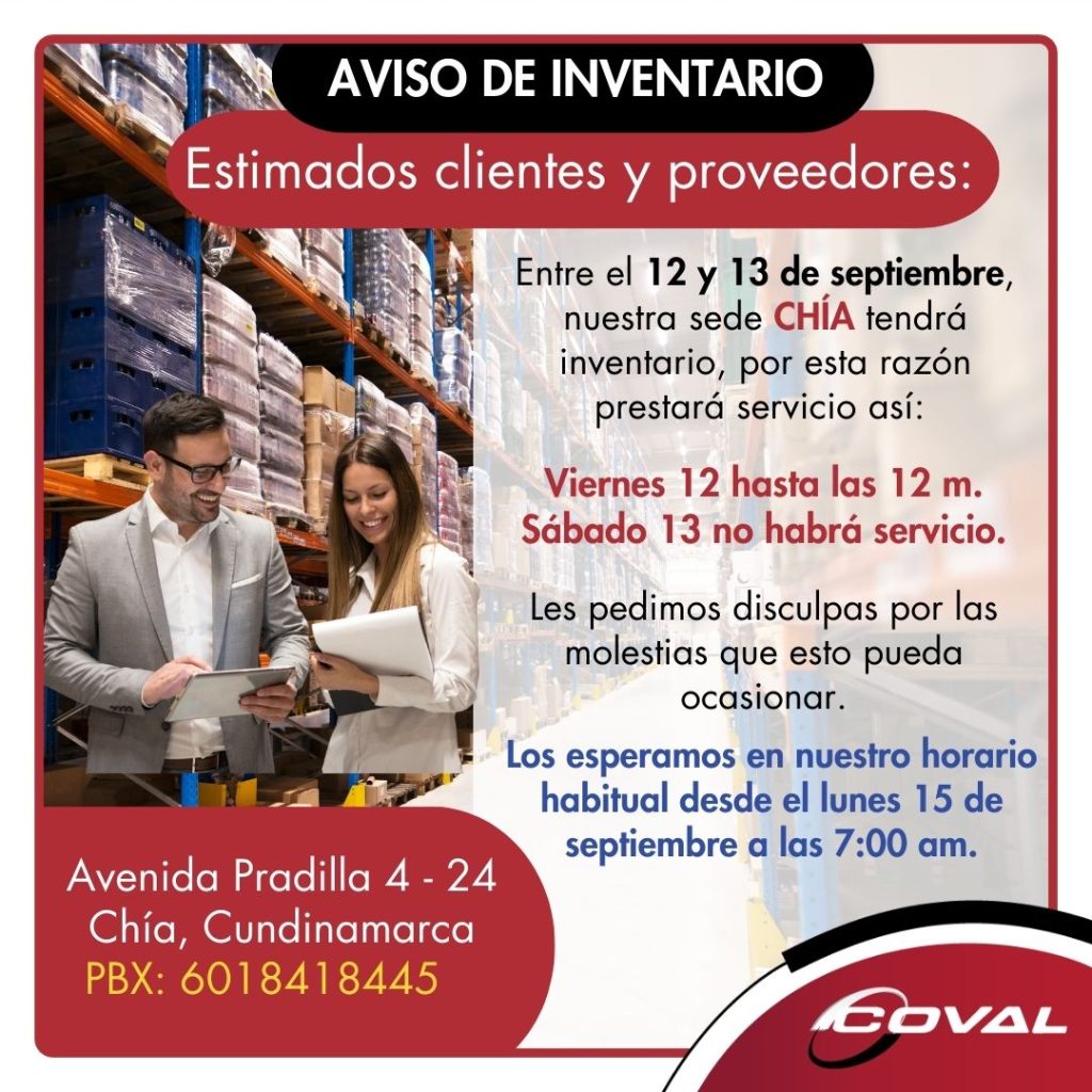 Entre el 12 y 13 de septiembre, nuestra sede de Chía tendrá inventario. Por esta razón prestarán servicio así: