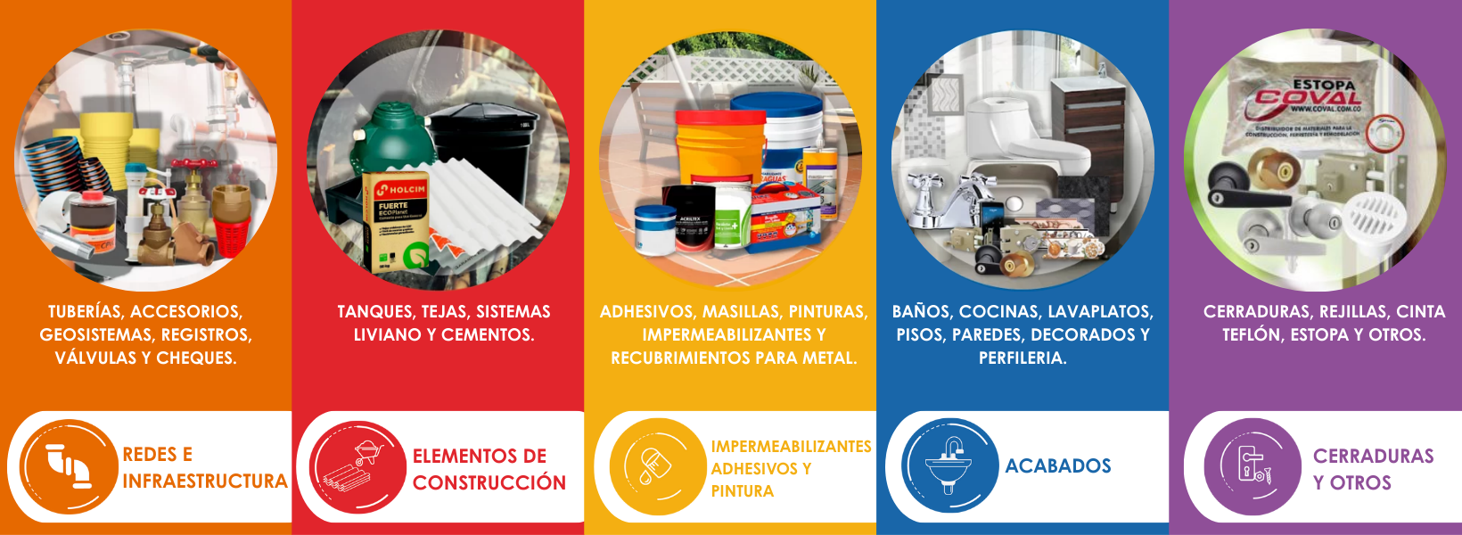 Pinturas para exterior, interior, esmaltes, estucos, yesos, anticorrosivos, aerosoles, accesorios, diluyentes, disolventes, removedores, e inmunizantes para madera entre otros. Con el respaldo de Pintuco, Ico, Corona, Eternit y Algreco.